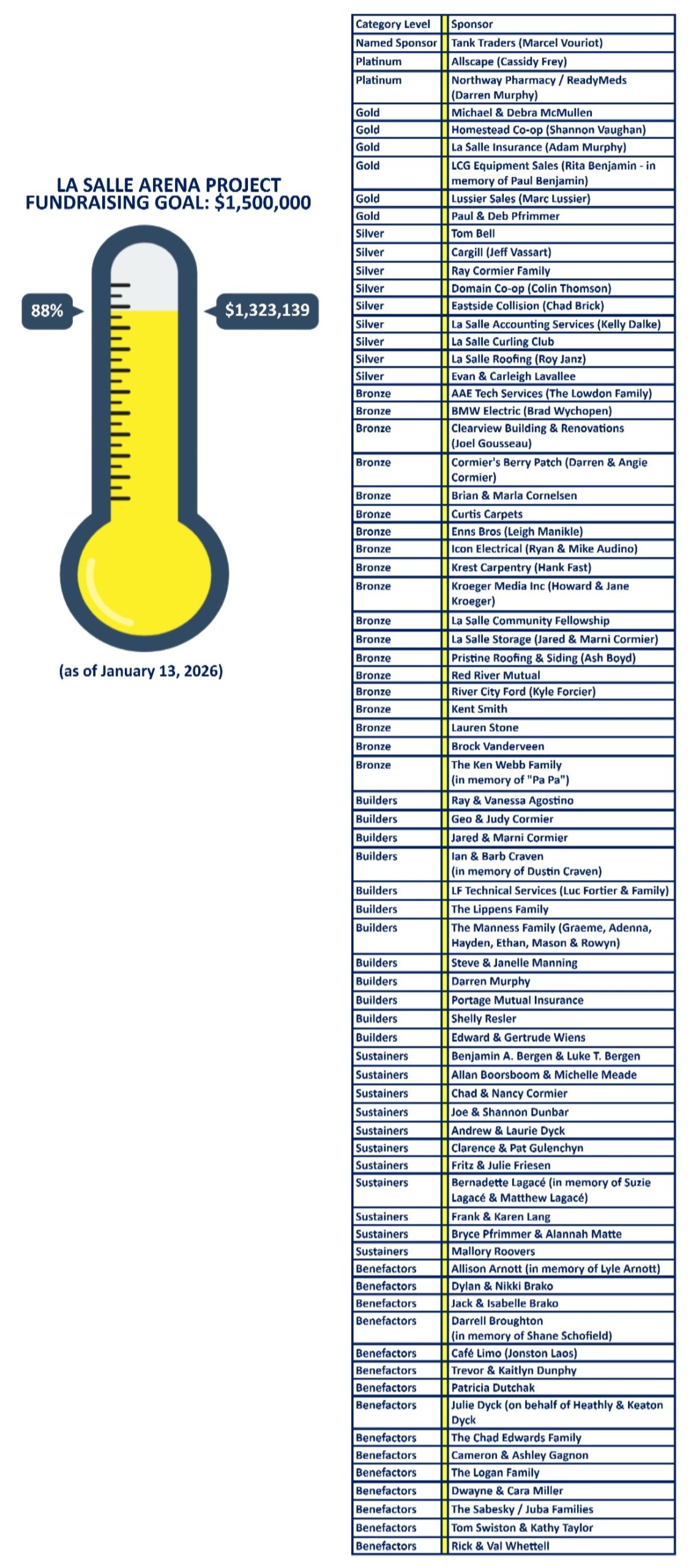 Thank you to our generous sponsors (as of January 13, 2026) that have contributed to 88% of our goal! Bringing the La Salle Arena Project to life for the community of La Salle would not be possible without your support!