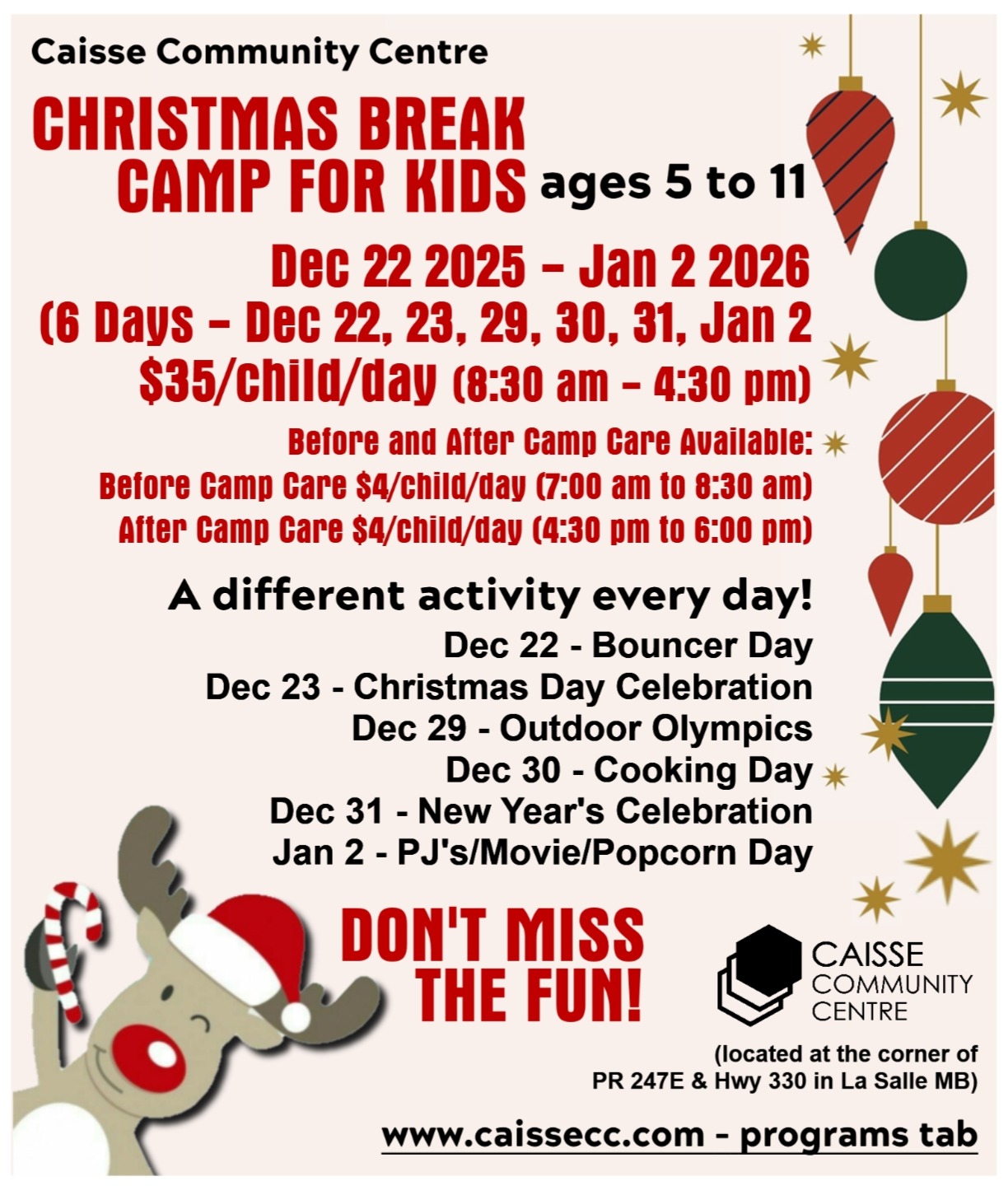 Providing Christmas Break Camp for children between the ages of 5 to 11 through the Caisse Community Centre. Space is limited. Pre-registration is required.
