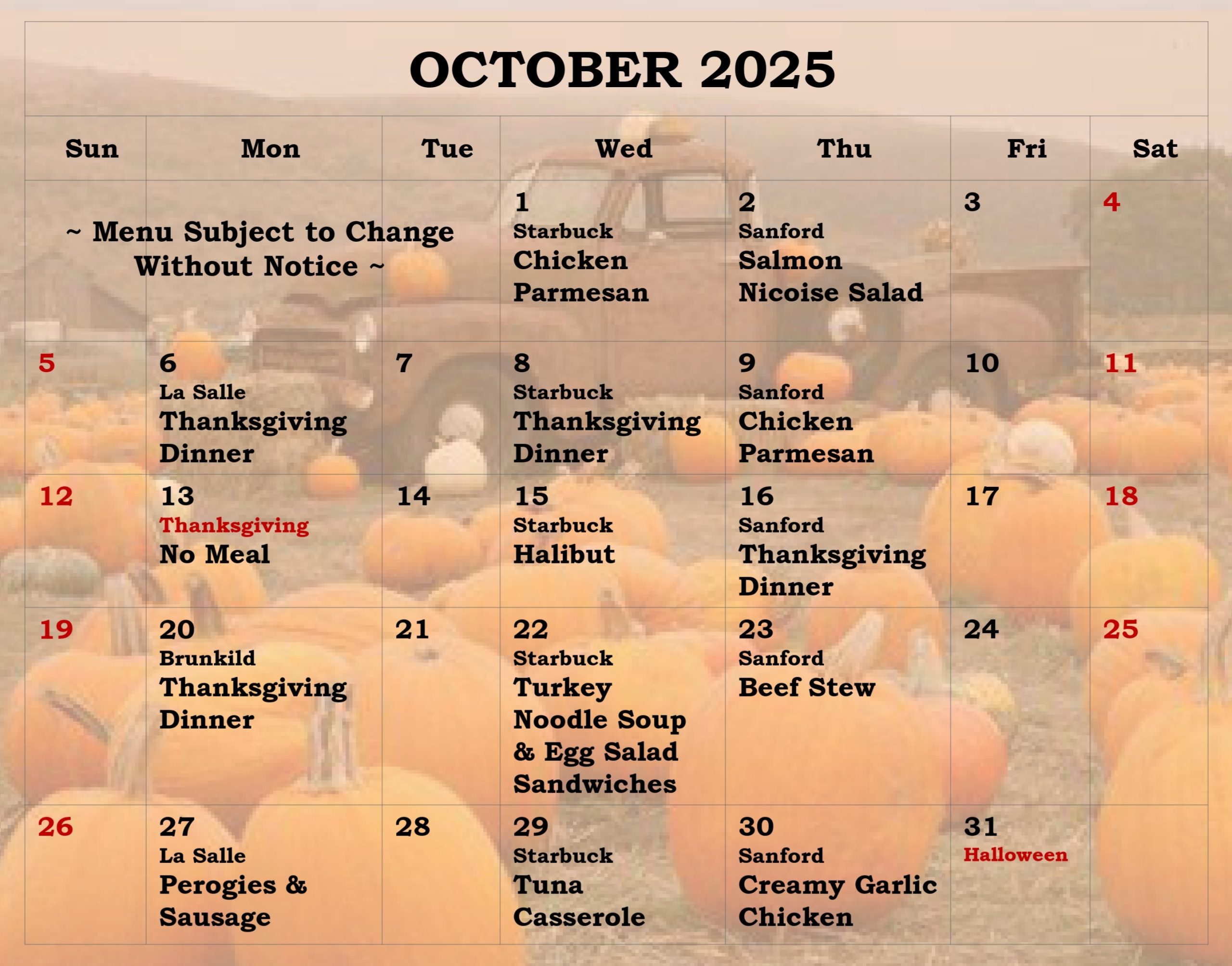 Please note:  Meal in Sanford on Thursday October 30th, 2025 will take place at the Meadowbrook Clubhouse.  All other meals in October for Sanford will take place at the Sanford Legion.