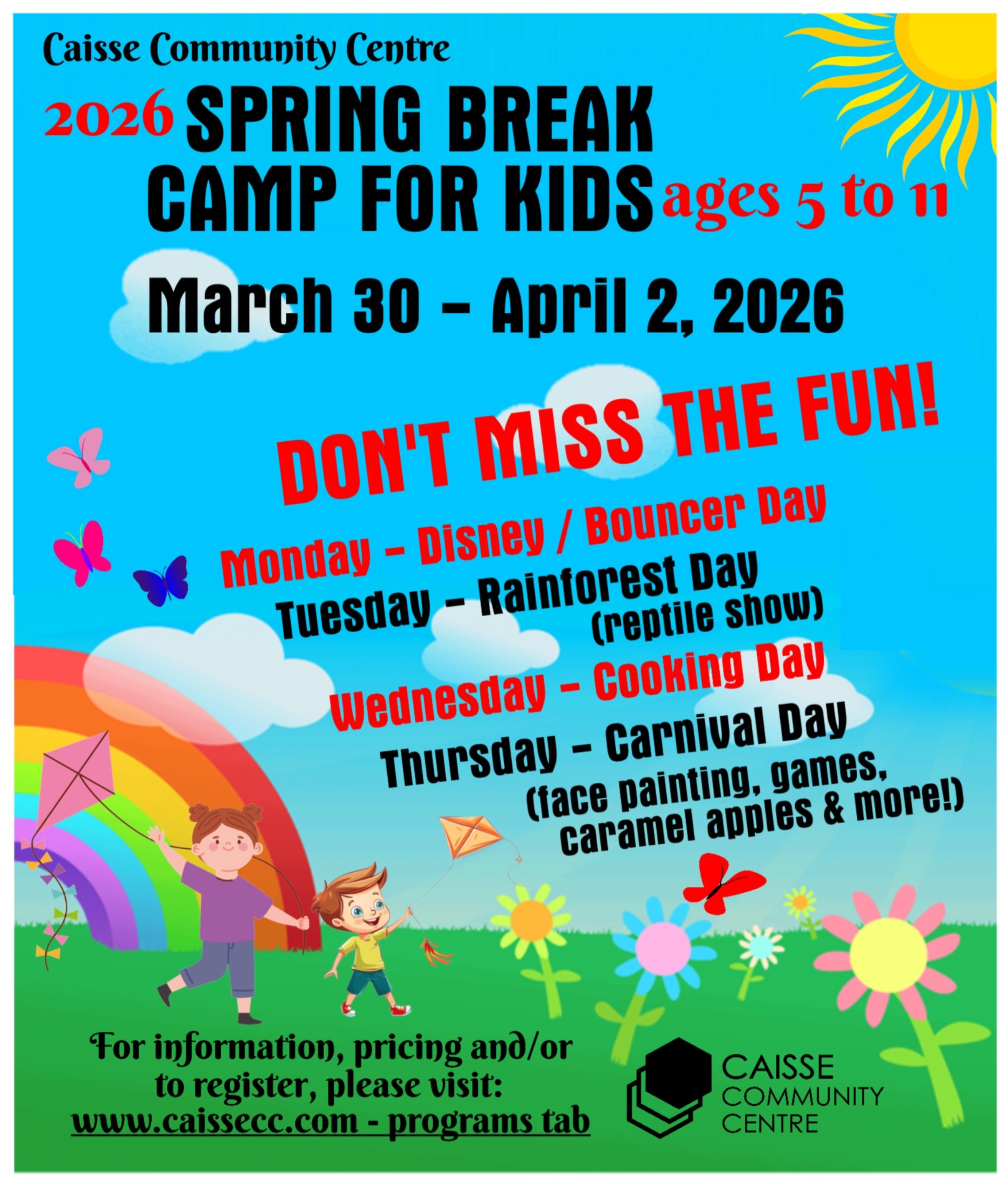 The Caisse Community Centre 2026 Spring Break Camp for Kids ages 5 to 11 Program promises to be fun and entertaining all week long!